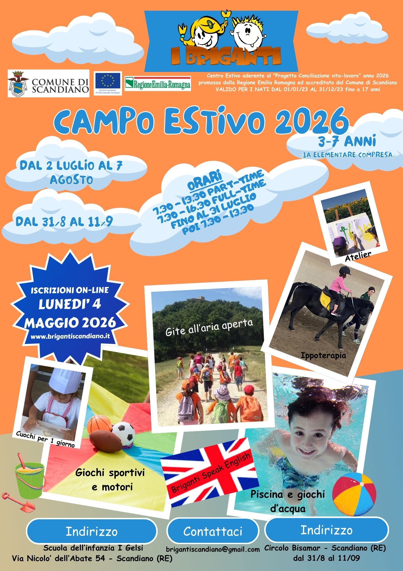 Da Lunedì 04/05/26 aprono le iscrizioni on-line al campo estivo per la fascia di età da 3 a 7 anni. Tutte le informazioni sono disponibili nella sezione Campo Estivo del nostro sito internet www.brigantiscandiano.it